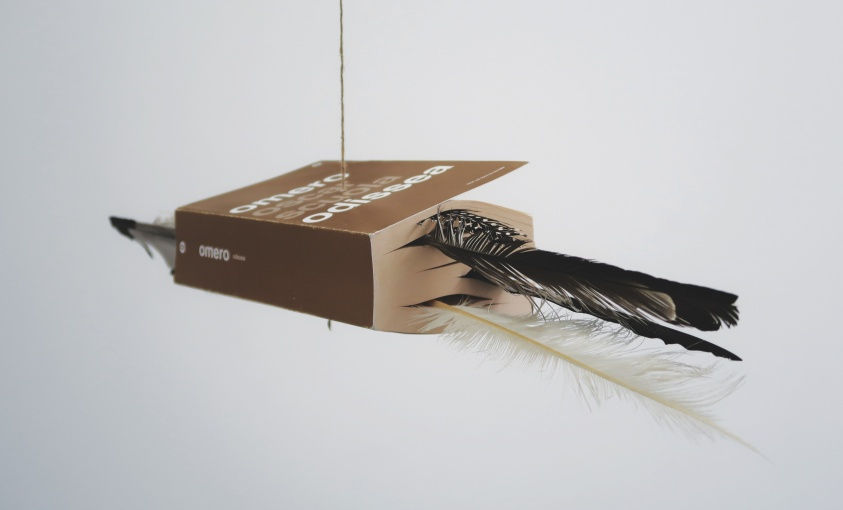Dans le lot, il y a Au bord du rêve, une œuvre étrange d’Elsa Charalampous qui se compose de disques vinyles – il est question d’une berceuse qui fait basculer la nuit vers le jour –, il y a Marco Godinho qui suspend deux exemplaires de L’Odyssée d’Homère, chacun doté de plumes d’oiseau pour convoquer la métaphore de l’exil (visuel ci-dessus). Aussi il y a Julien Hübsch et sa sculpturale façon (via une sangle) de faire cohabiter deux modes de construction, par la pierre (de chantier) et par le savoir (le livre); le savoir, c’est aussi ce qui perfuse Homo libri, les petits monuments sculpturaux anthropomorphiques de Florence Hoffmann… qui emboîte/étage de vieux livres au point de leur façonner une silhouette humaine. Ça se passe donc au Cercle Cité, espace du Ratskeller, jusqu’au 21 juin – et j’y reviendrai.